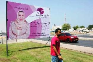تشهد بورصة الترشيحات الى انتخابات مجلس الشورى في سلطنة عمان المقررة في 15 اكتوبر الجاري، اقبالا نسائيا لافتا، حيث وصل عدد المرشحات الى 77 للمجلس المكون من 84 عضوا وفي الصورة رجل يمر قرب لافتة للمرشحة عزيزة الحبسية في مسقط (ا ف ب)