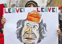“I am not going to leave this land. I will die here as a martyr,” Gadhafi said on state television, refusing to bow to calls from his own diplomats, soldiers and protesters who braved a fierce crackdown to clamor in streets for him to go. “Moammar Gaddafi is the leader of the revolution, I am not a president to step down … This is my country. Moammar is not a president to leave his post, Moammar is leader of the revolution until the end of time.” “I shall remain here defiant,” said Gadhafi, who has ruled the mainly desert country with a mixture of populism and tight control since taking power in a military coup in 1969.