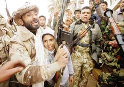 In Benghazi, where the rebellion started a week ago, the mood was triumphant. Effigies of Gadhafi and his clan hung from lampposts, men chanted slogans and fired guns into the air and the town was being run under “people’s committees.”
