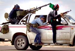 At the front line in the desert scrub about 5 kilometers outside the town, gateway to the rebel-held east, fighters said air strikes were helping to cripple Gadhafi’s heavy armor. When asked why rebel units had not advanced, Ahmad al-Aroufi, a rebel fighter at the front line, told Reuters: “Gadhafi has tanks and trucks with missiles.”