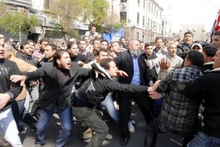 In the capital, Damascus, people shouting in support of the Daraa protesters clashed with regime supporters outside the historic Umayyad mosque, hitting each other with leather belts.