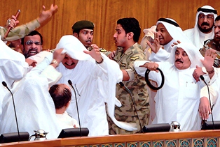 Chaos erupted when Jamaan al-Harbash of the Sunni Muslim Brotherhood told Kallaf the debate was not called to discuss Al-Qaeda but Guantanamo prisoners. Two Shiite and four Sunni lawmakers were involved in the fight prompting acting Speaker MP Abdullah al-Rumi to adjourn the session.