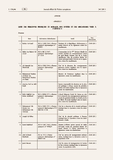 ضم الملحق بقرار العقوبات الذي وقعته الممثلة العليا للاتحاد الاوروبي للشؤون الخارجية والسياسة الامنية، الاسماء الاتية بحسب التسلسل والتوصيف الذي جاءت فيه: