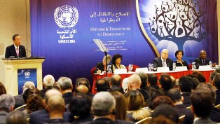 استعادت بيروت بريقها امس. بريق عكسته التظاهرة الدولية في مؤتمر "الاصلاح والتحول نحو الديموقراطية"، وبلغ اوجه في الخطاب التاريخي الذي ألقاه الامين العام للامم المتحدة بان كي - مون راسما من العاصمة اللبنانية "خريطة طريق" الربيع العربي للمرحلة المقبلة. ورأس المنظمة الدولية خاطب ممثلي الشعوب العربية وقادتها من القاعدة، انطلاقاً من شواهد حية خبرها مع الشارع العربي ومجتمعاته بدءاً من تونس مروراً بليبيا وصولاً الى مصر، لكن الرسالة الابلغ كانت تلك التي وجهها الى الرئيس السوري بشار الاسد مخاطبا اياه بالمباشر: "أقول للاسد اوقف العنف. اوقف قتل شعبك. طريق القمع مسدود"، مذكراً بدعواته الحكام الى الاستماع الى ما يريده الشعب، وملاحظاً ان بعضهم استمع، لكن بعضهم الآخر لم يستمع".
