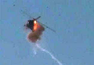 وفي شريط فيديو بثه ناشطون في موقع "يوتيوب" الالكتروني، يمكن رؤية مروحية تحلق قبل ان يسمع صوت انفجار، فيقول صوت مسجل على الشريط "صاروخ". بعد لحظات، تشاهد كتلة من النار في المروحية، بينما يصرخ عدد من الاصوات "اصيبت، الله أكبر، الله أكبر".