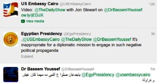 اذ وبعد ضجة اعلامية أثارها الحساب الرسمي للسفارة الأميركية في القاهرة على تويتر بنقله الرابط أمس لفيديو ستيوارت الذي يدافع فيه عن يوسف، تراجعت السفارة بعد أقل من 24 ساعة وحذفت الرابط بعد انتقادات من الرئاسة المصرية. فالتغريدة التي حملت عبارة "برنامج جون ستيوارت حول باسم يوسف" ومعها الرابط، أثارت غيظ الرئاسة المصرية والتي ردت على السفارة الأميركية بالقول "من غير اللائق لبعثة ديبلوماسية أن تنخرط بهكذا دعاية سياسية سلبية".